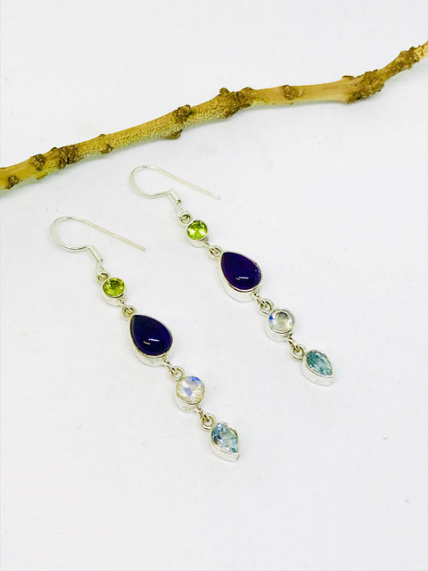 Amethyst, moonstone, bluetopaz, peridot earrings set in sterling sliver 92.5Natural authentic stones. Perfectly matched. Length- 2 inch.
