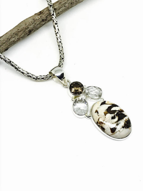 Peanut wood stone, clear quartz and smokey topaz pendant set in sterling silver.