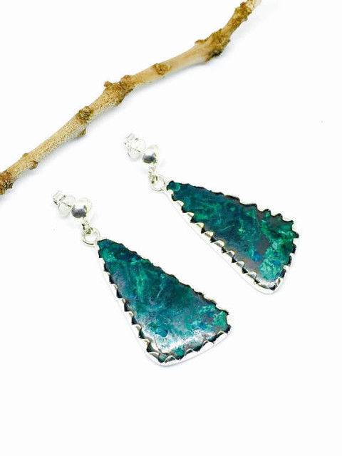 Chrysocolla, malachite, azurite, lapiz lazuli post earrings set in sterling silver 92.5. Unique one of kind earring. Length - 1.8 inch long