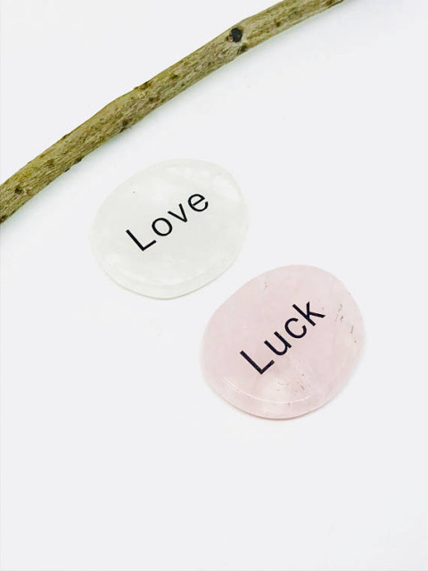 Word stone river rock stone with love and luck engraved. Moonstone and rosequartz. Natural authentic stones.